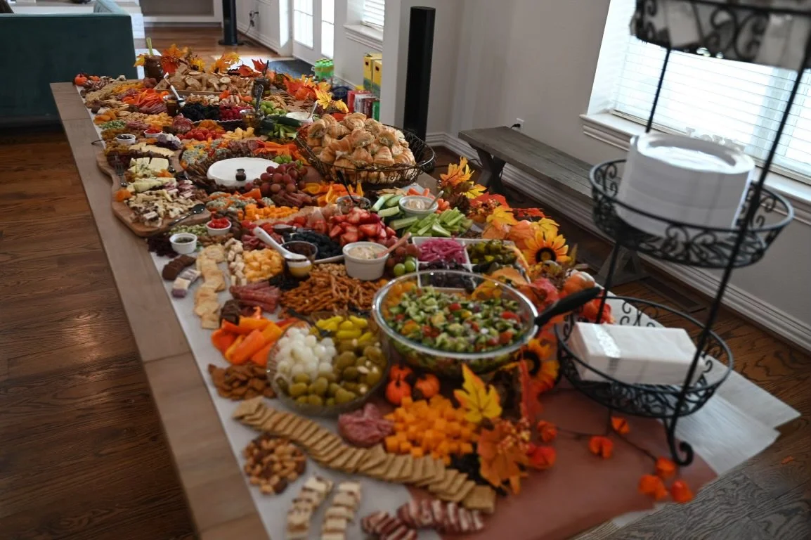 A large buffet table filled with a variety of foods including fruits, cheeses, breads, vegetables, and meats, decorated with autumn leaves and sunflowers, in a bright room with hardwood floors.