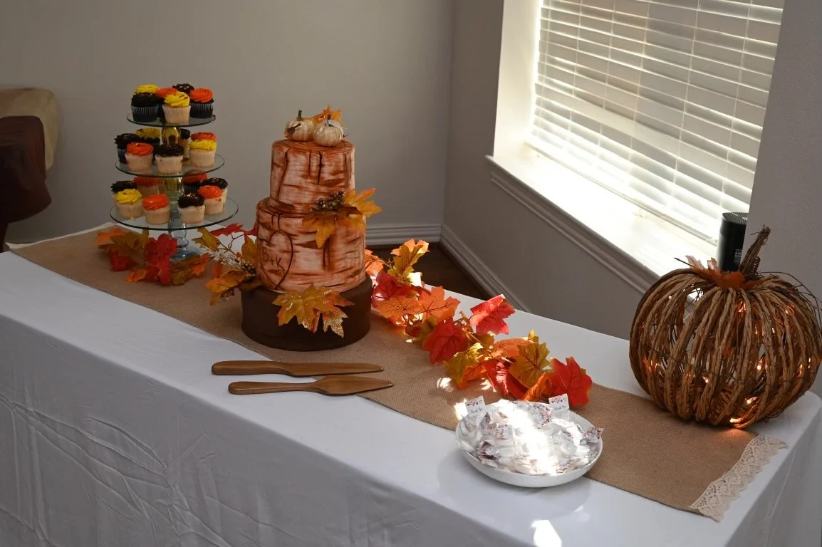 Autumn-themed dessert table with a rustic tree-trunk cake, cupcake tower in fall colors, decorative leaves, and a wicker pumpkin, on a white tablecloth.