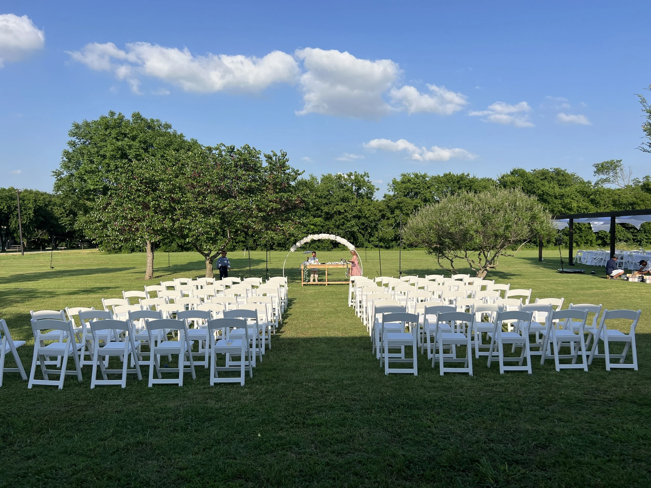 Outdoor wedding setup with white folding chairs arranged in rows on a grassy field, adorned with colorful floral arrangements.
