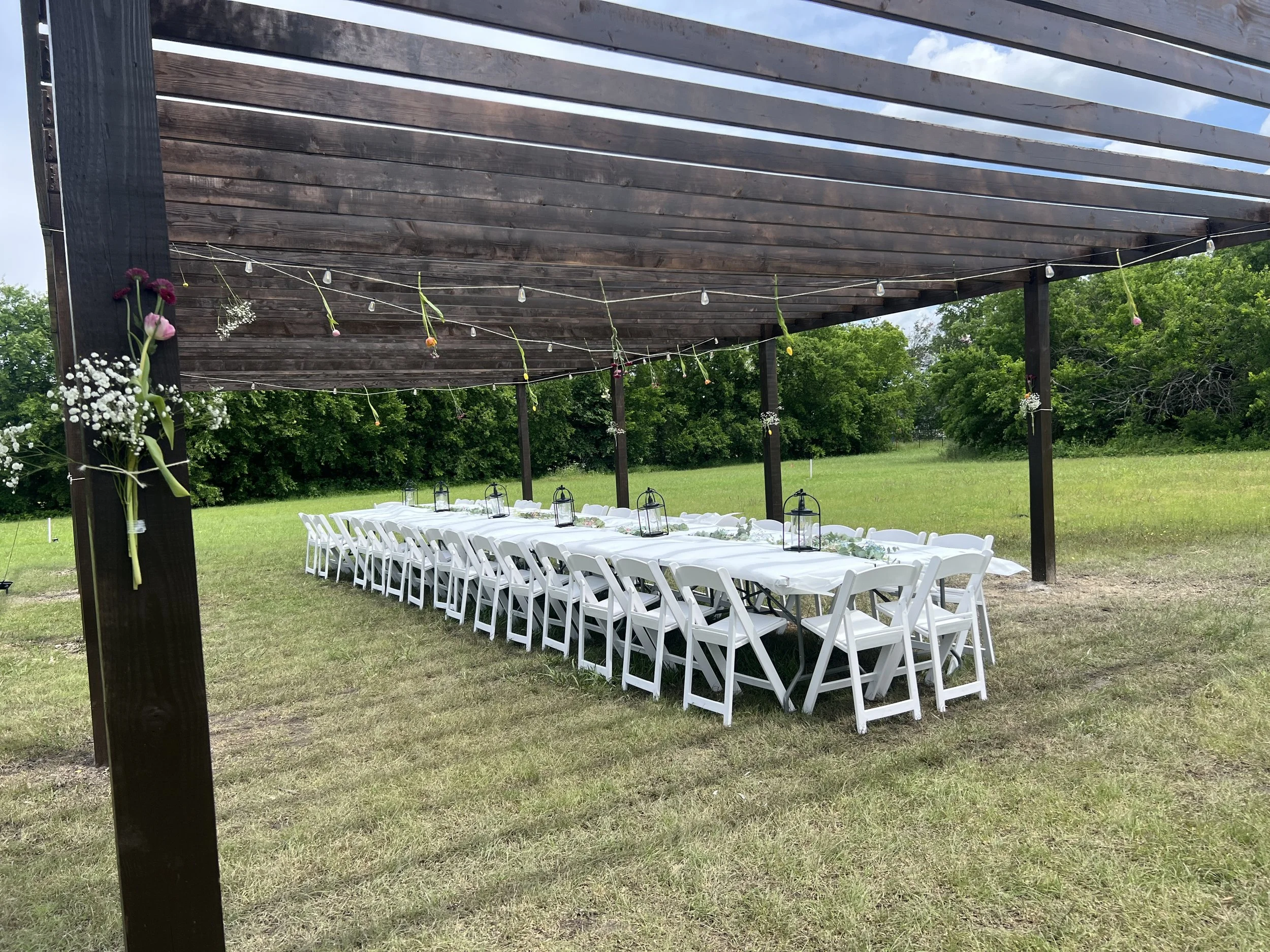 Outdoor event setup with a long white table, white chairs, decorative lanterns, and floral accents under a wooden pergola with string lights, on a grassy field surrounded by trees.