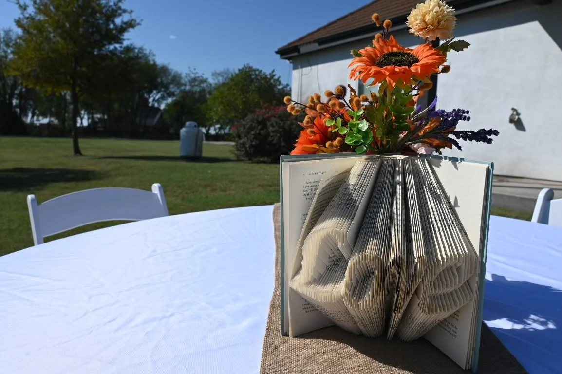 Open book with folded pages spelling 'Love,' adorned with a bouquet of orange and white flowers, placed on a table outdoors. White chairs and a building in the background.