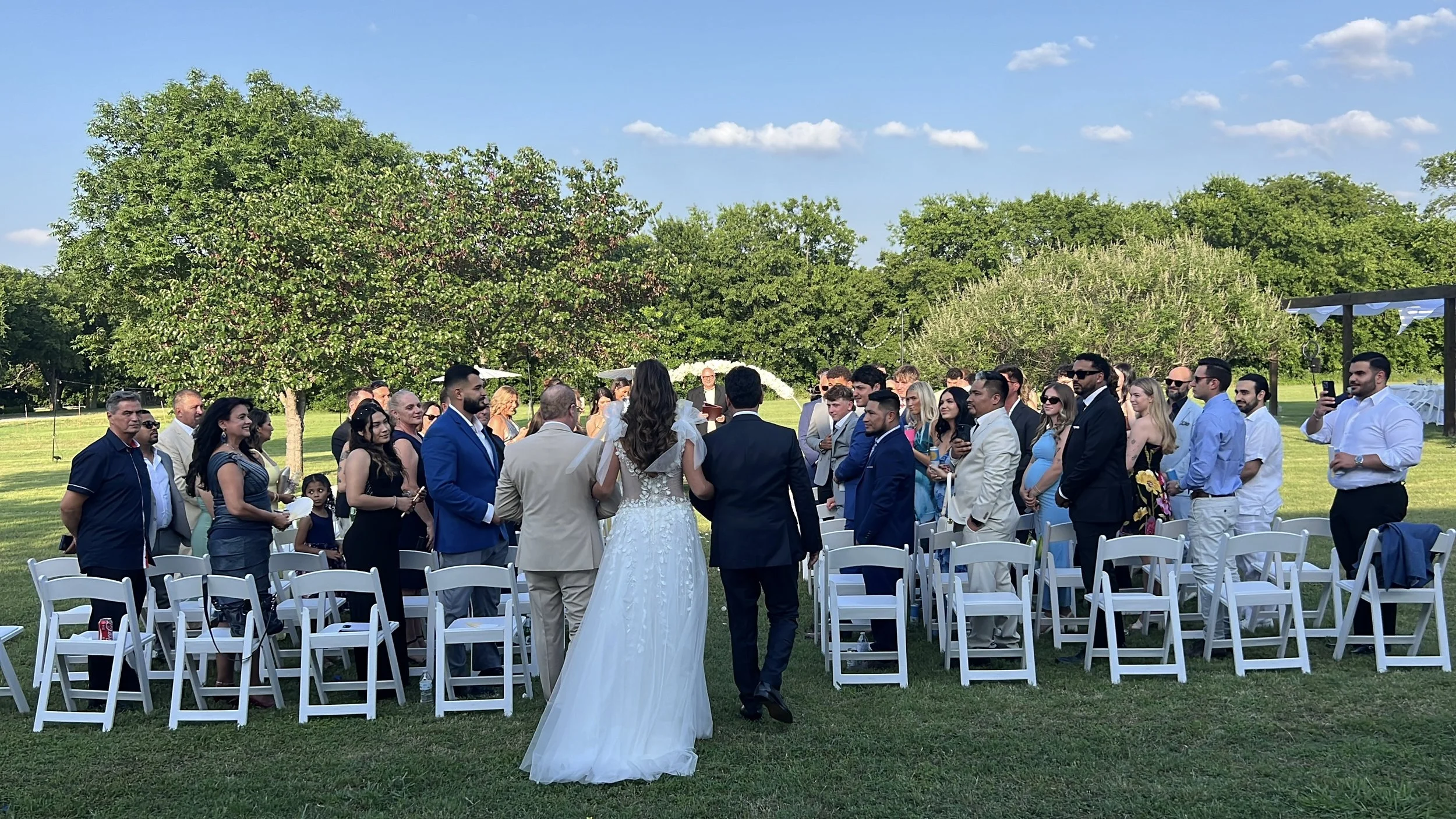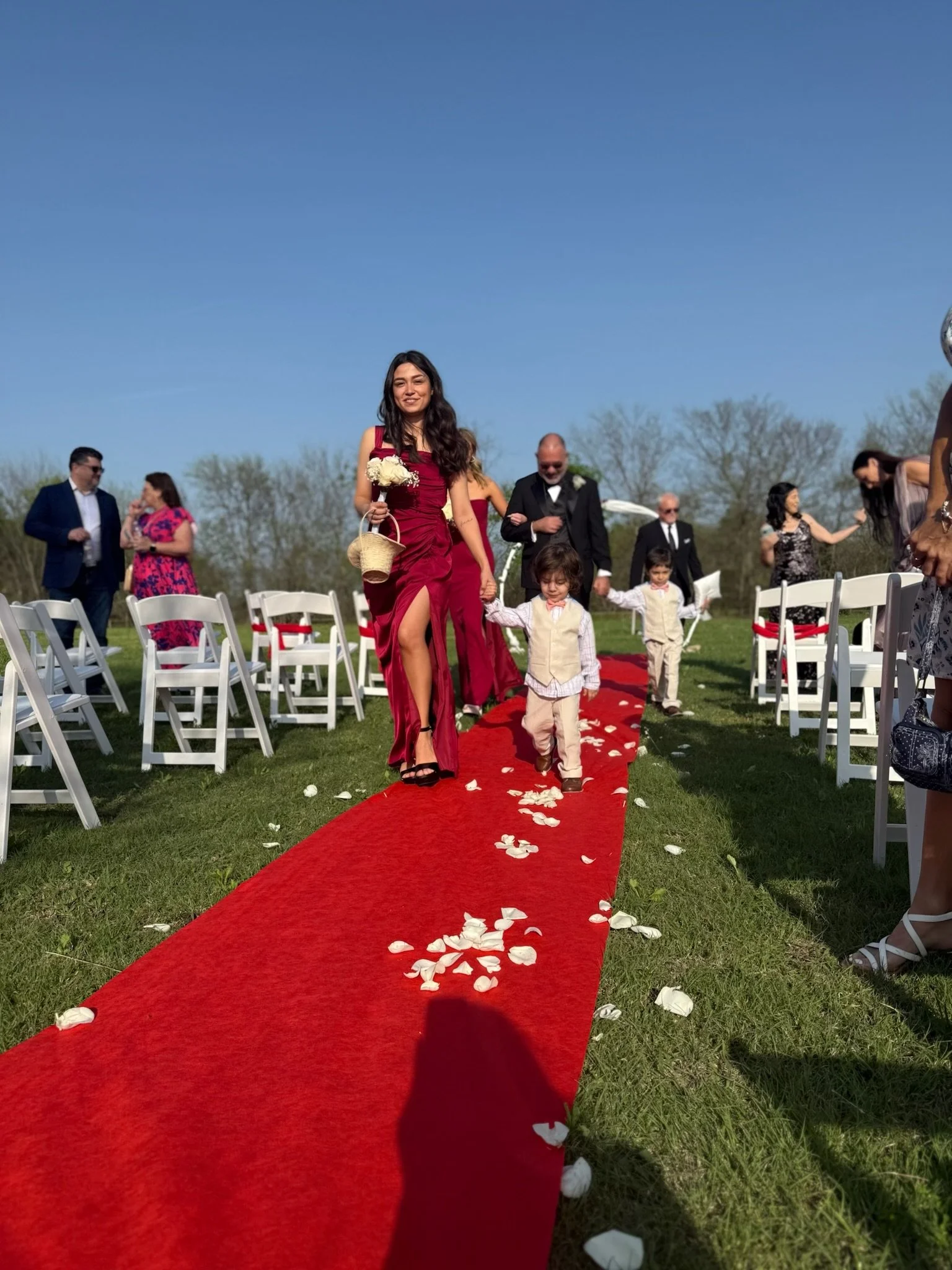 Outdoor wedding scene with people walking down a red carpet lined with white rose petals, surrounded by folding chairs and a blue sky backdrop.