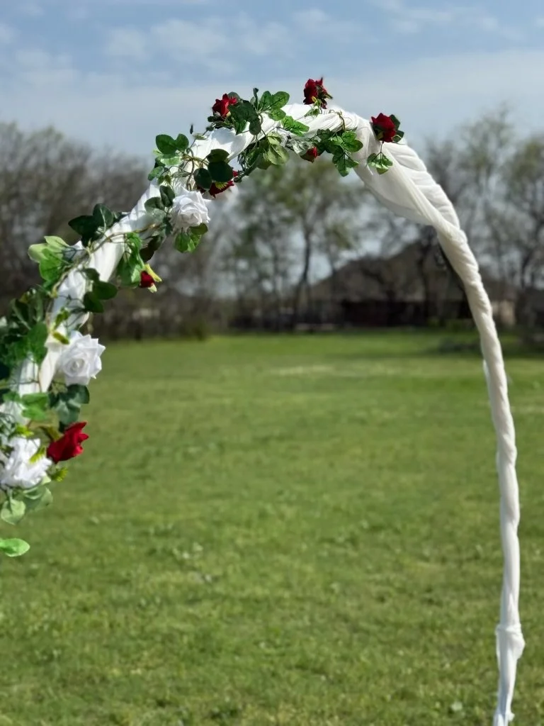 Outdoor wedding arch decorated with white fabric and red and white flowers on a grassy field background.