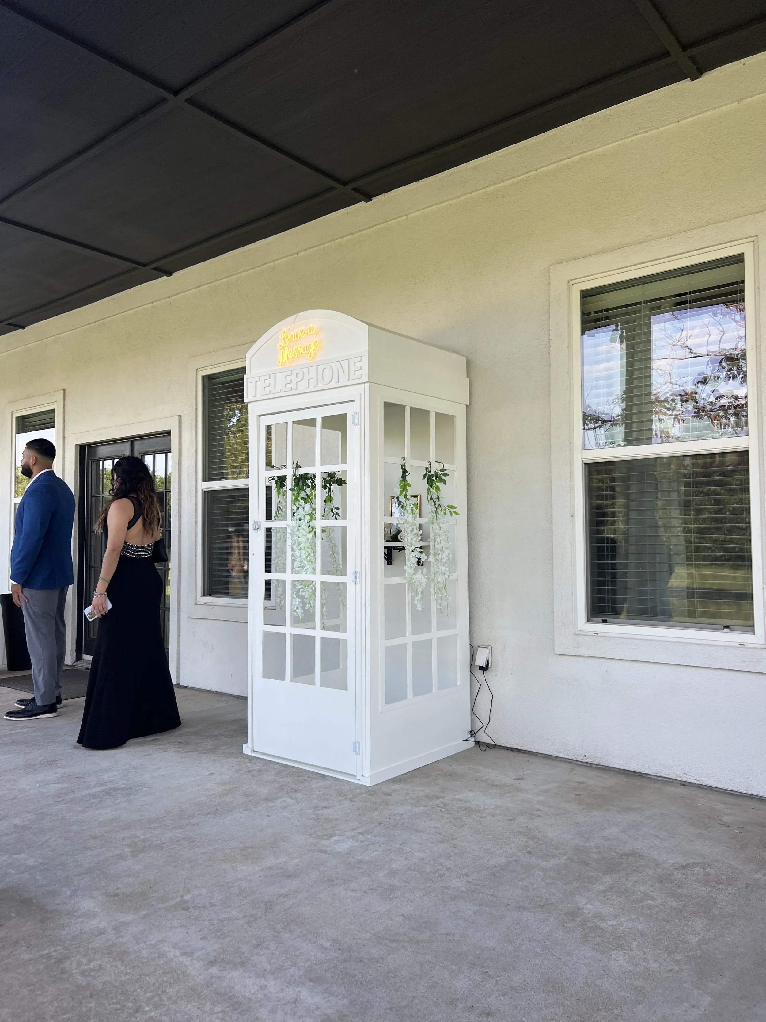A white vintage phone booth decorated with greenery and white flowers, located outside on a concrete patio next to a white wall with windows, during a social event with people dressed formally.