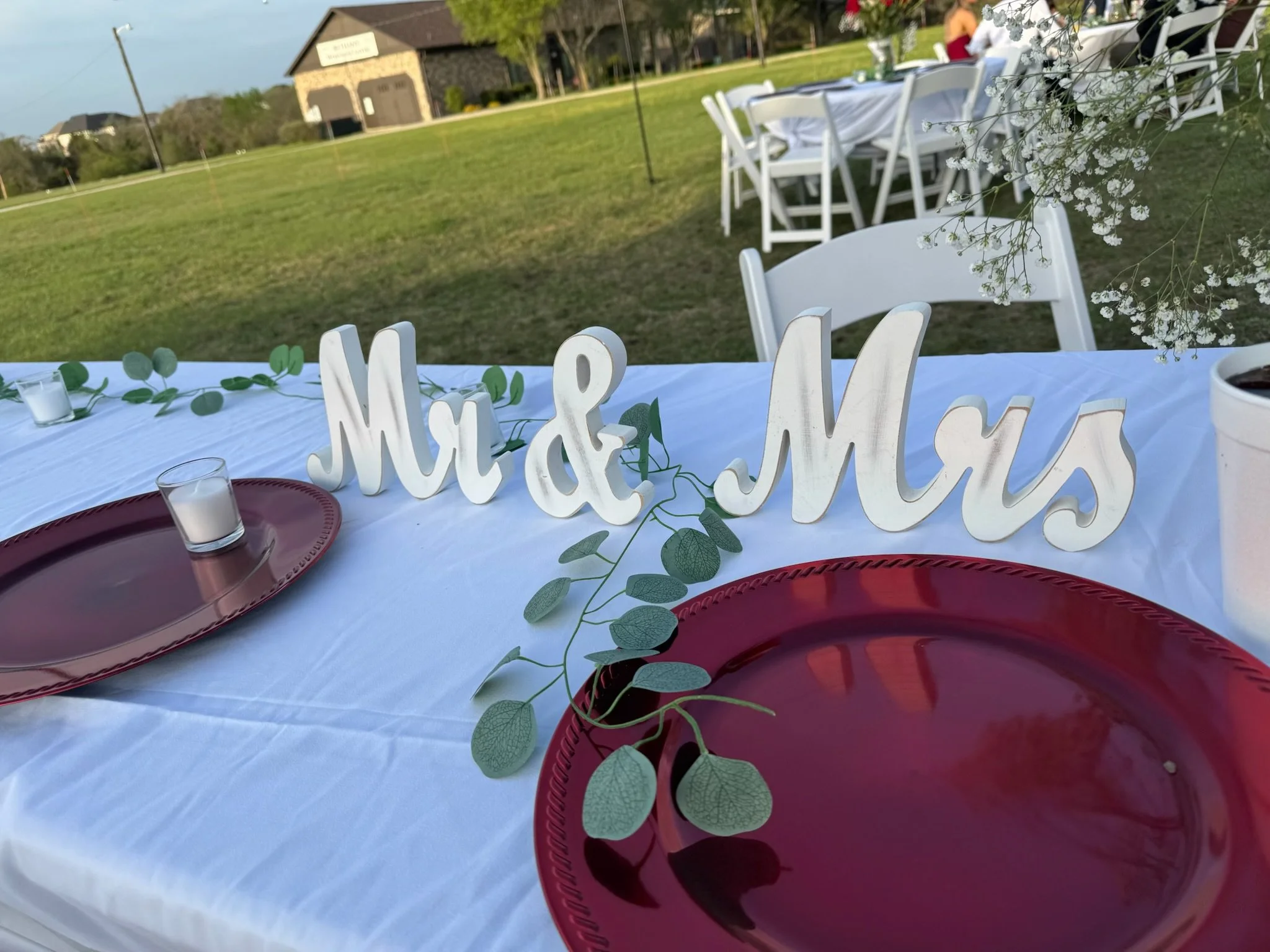 Wedding reception table setup outdoors with white tablecloth, red plates, "Mr. & Mrs." sign, greenery, and candles.