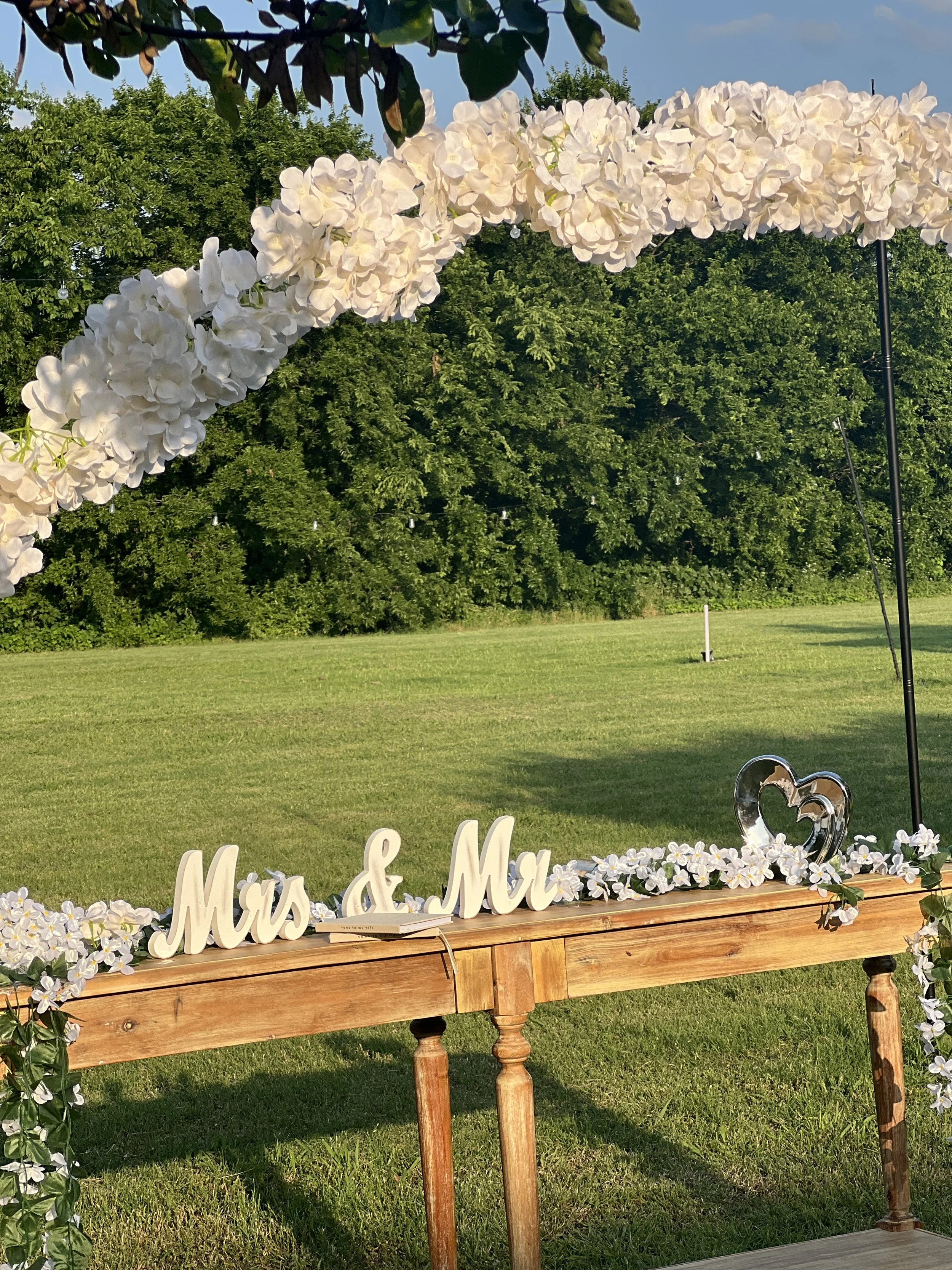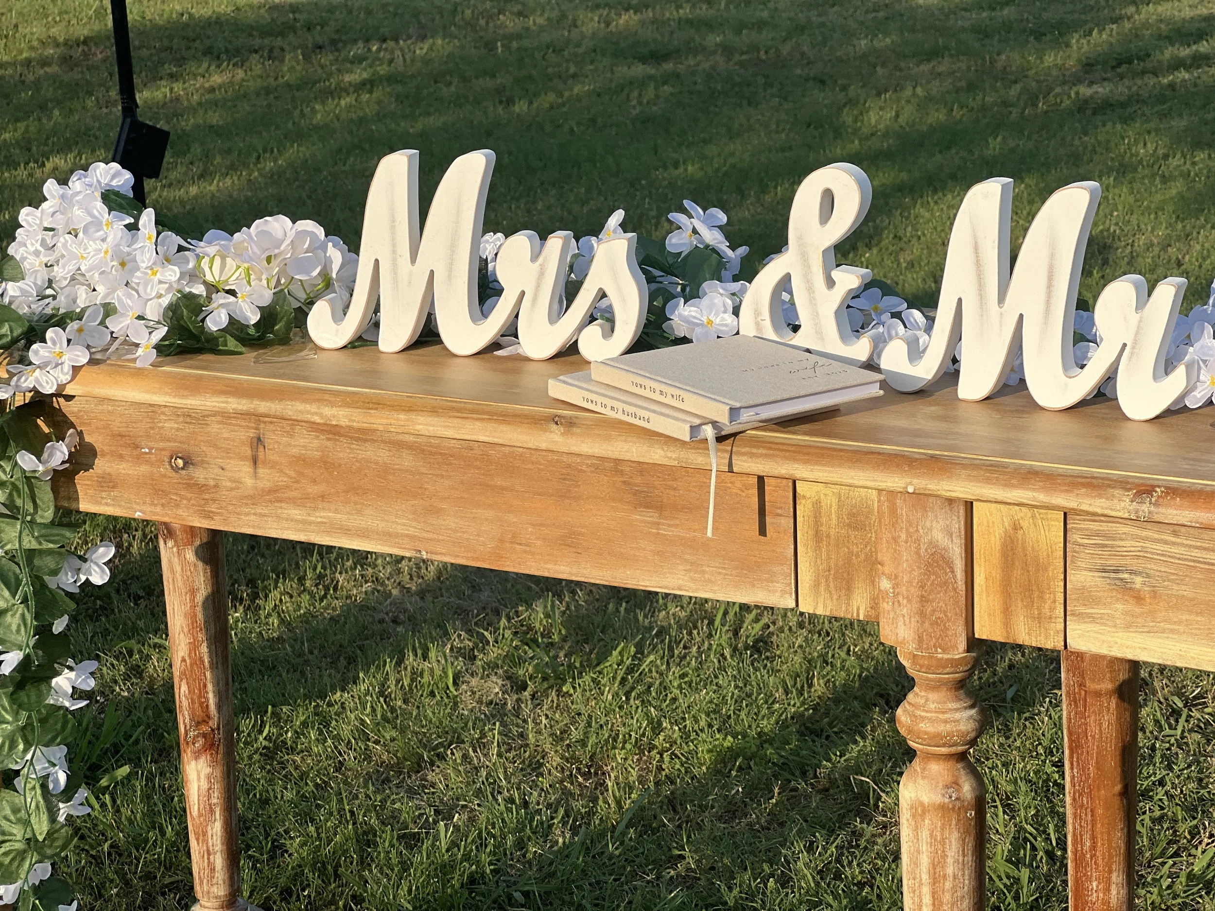 Wooden table outdoors decorated with white flowers and cursive "Mrs & Mr" signs, with a guest book on top, for a wedding celebration.