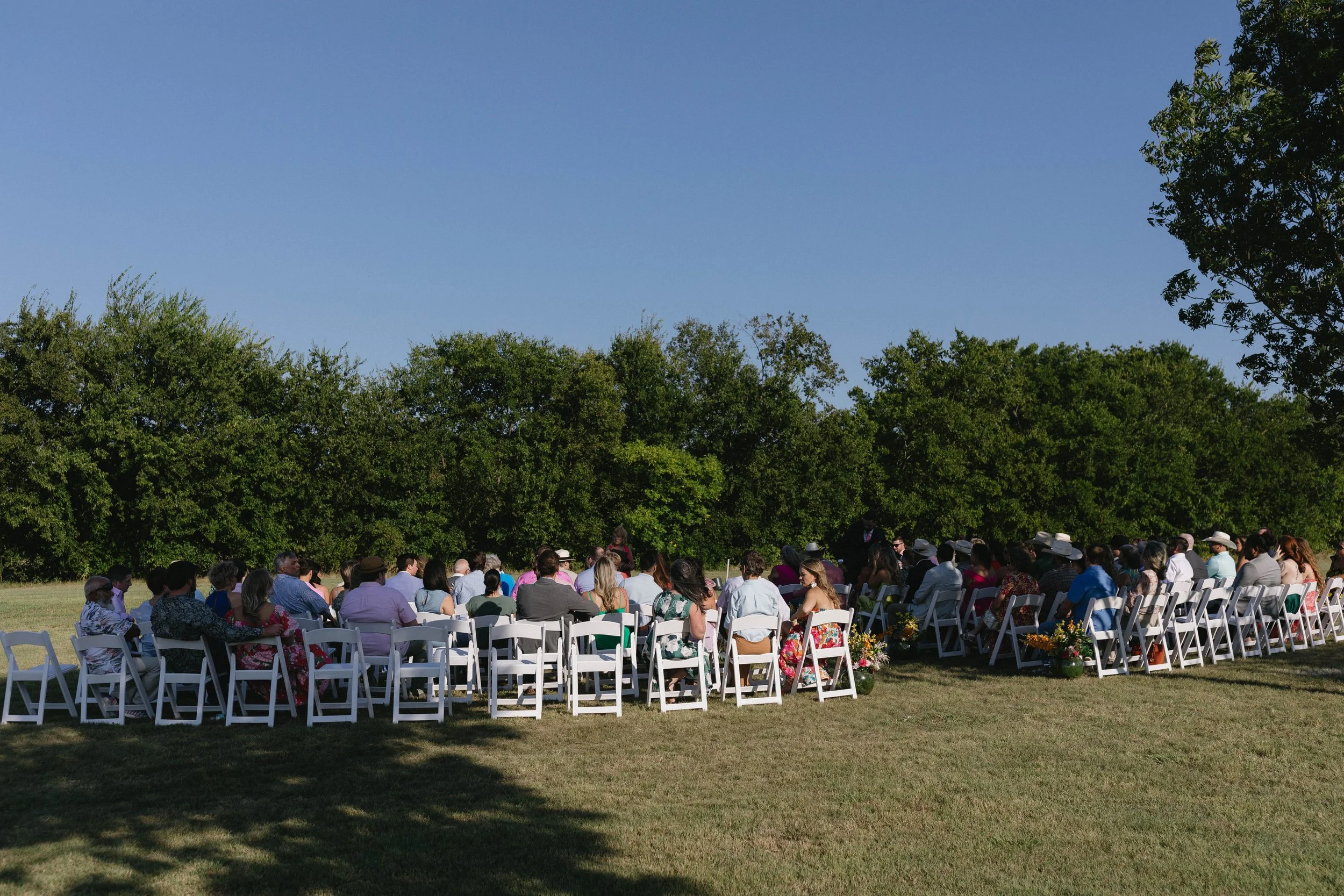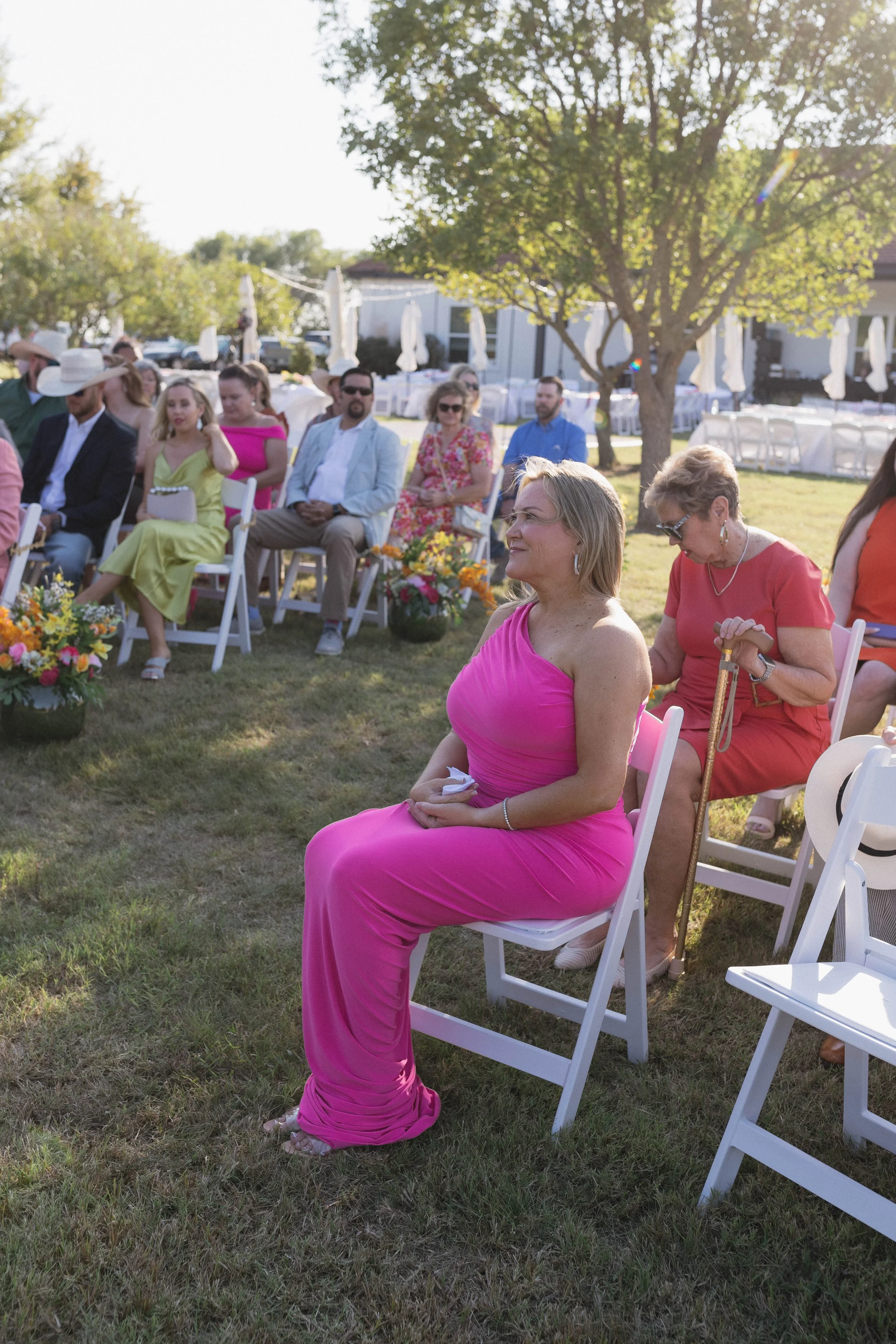 A group of people sitting outdoors in white folding chairs at a formal event. A woman in a pink dress is in the foreground. The setting is grassy with trees and a building in the background. Bright floral arrangements are along the seating area.
