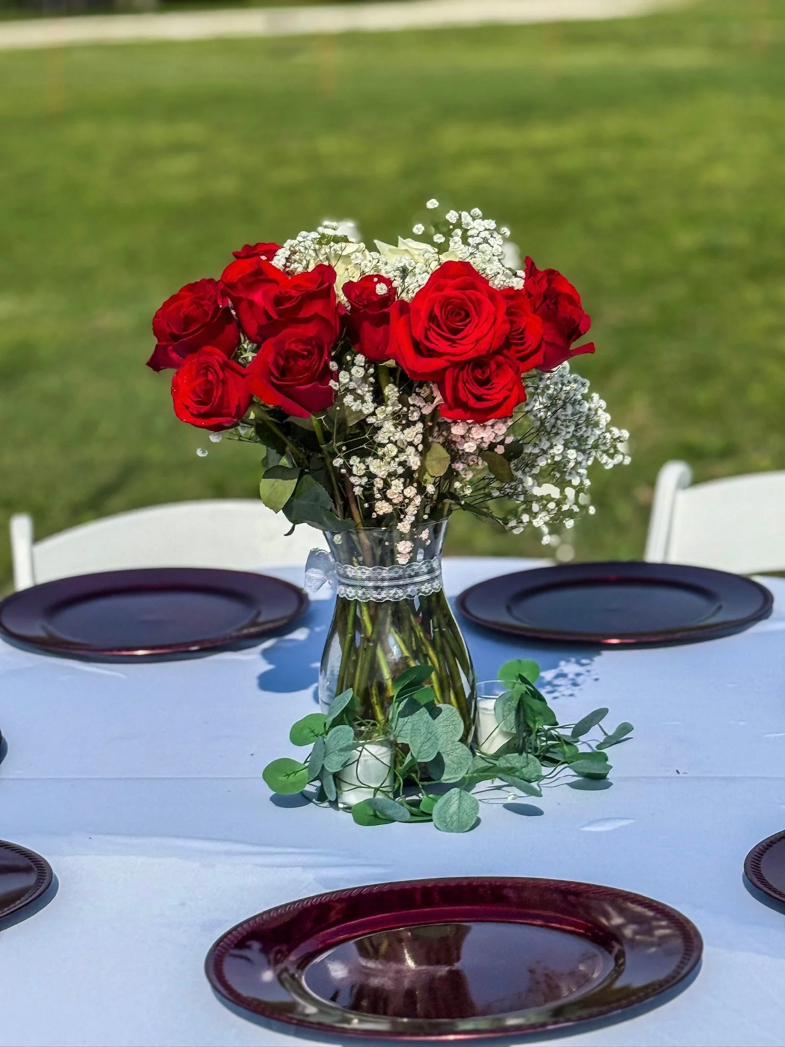 Red roses in a vase with baby's breath on a table with red plates and white tablecloth, set outdoors on a grassy field.