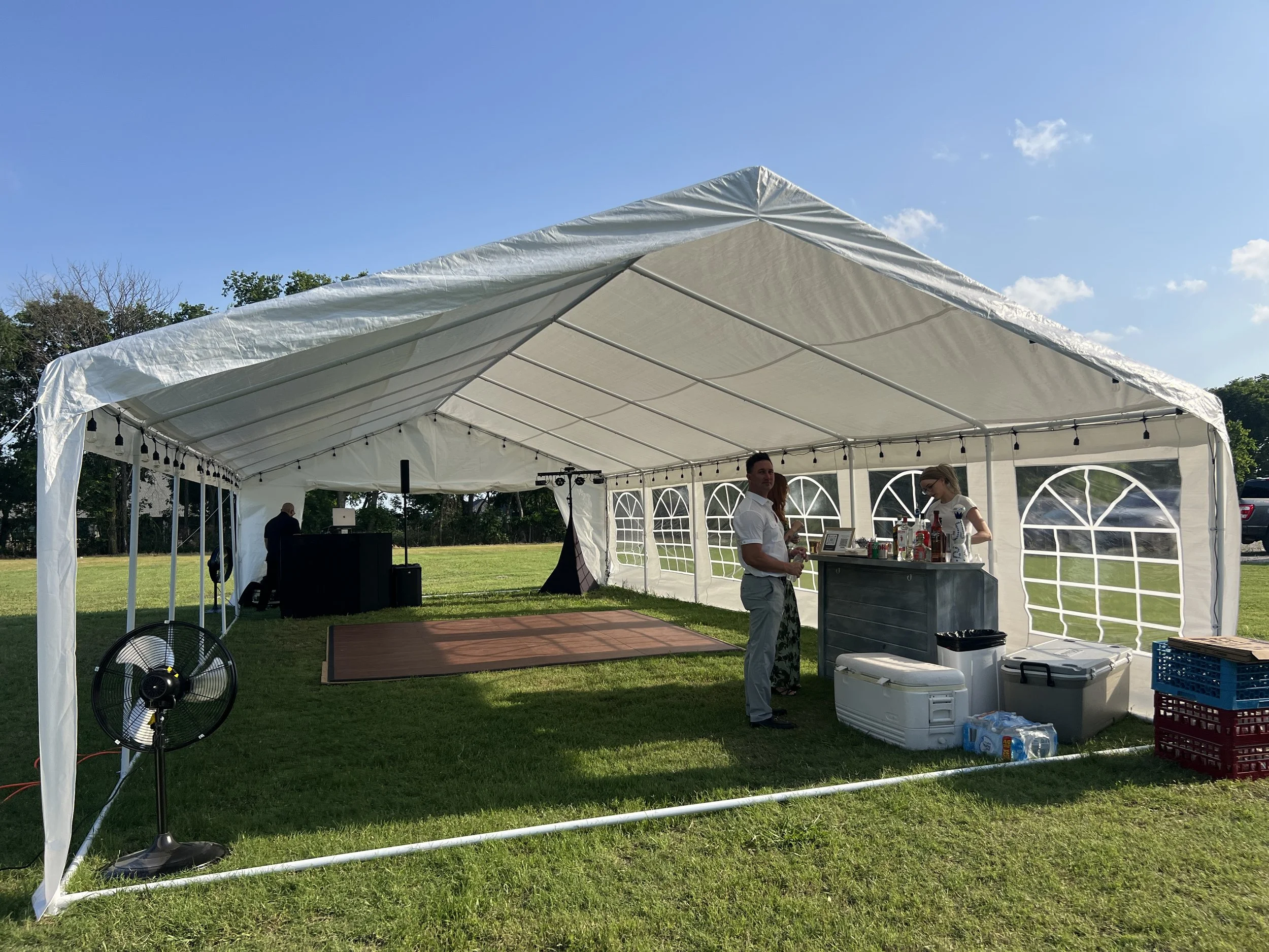 A large white event tent set up on a grassy field with people inside, including a bartender at a bar, a DJ near sound equipment, and a fan near the front.