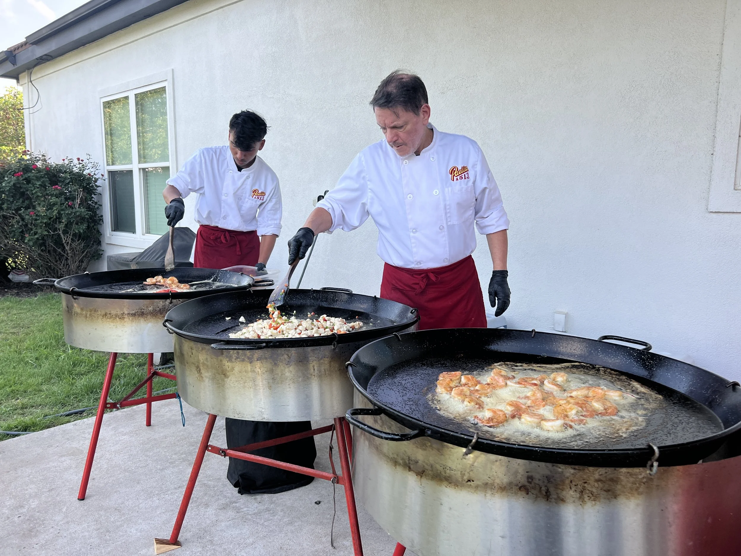 Two chefs cooking outdoors on large circular grills with shrimp and other ingredients, wearing white chef jackets and red aprons.