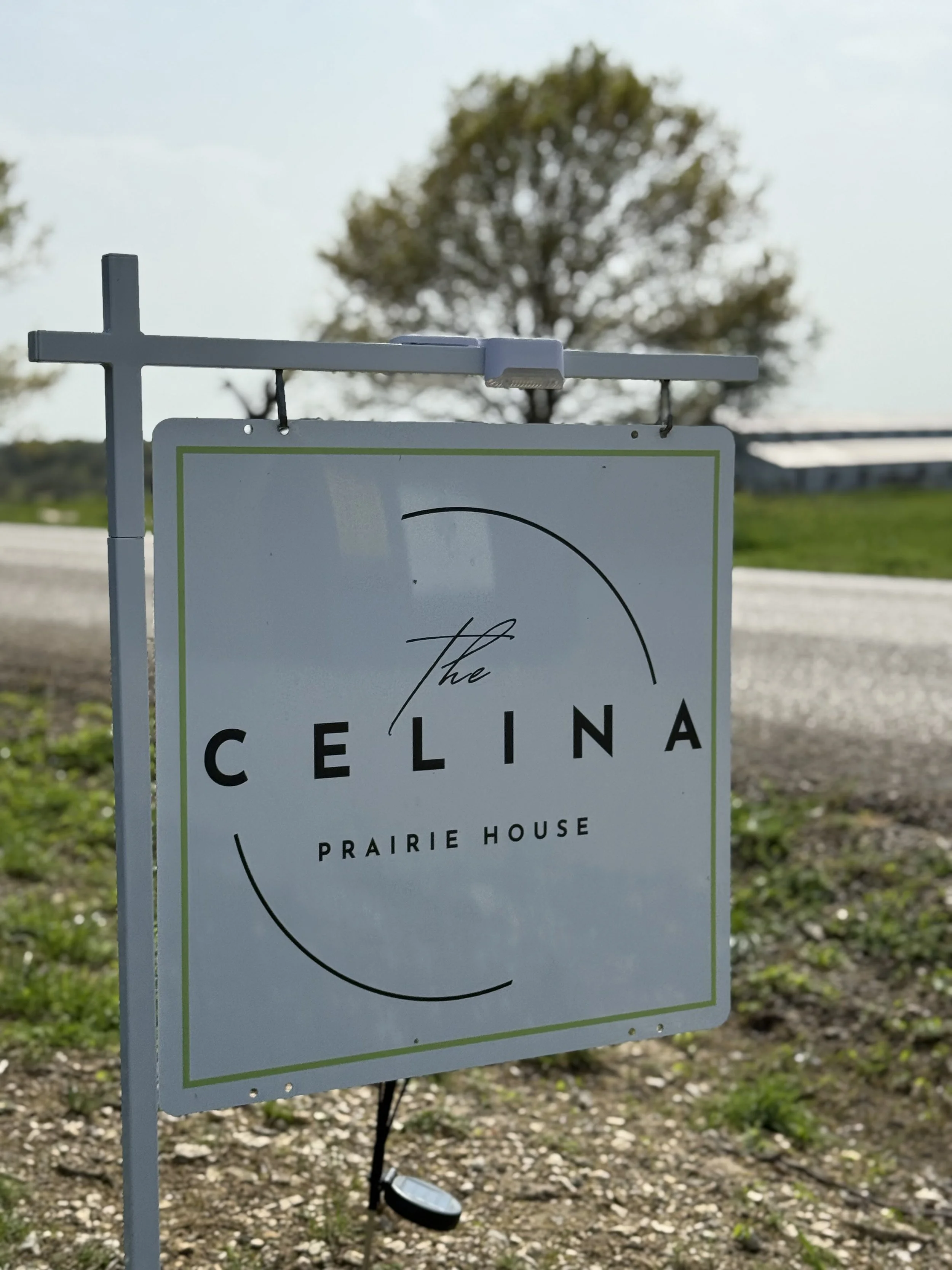 Sign reading "THE CELINA PRAIRIE HOUSE" with a rural background including a tree and open sky.