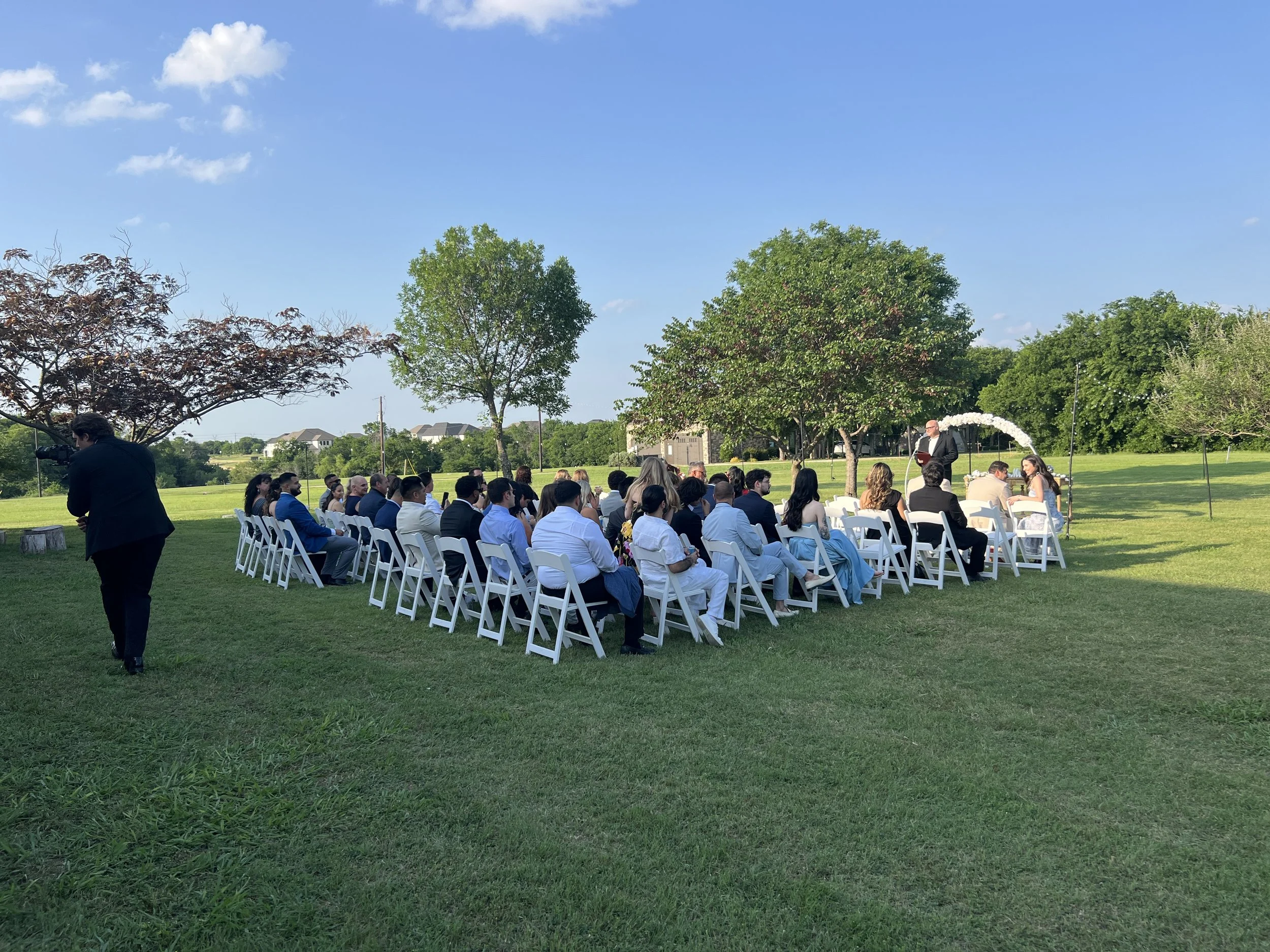 Outdoor wedding ceremony with guests seated in rows of white chairs facing a podium, surrounded by trees and greenery.