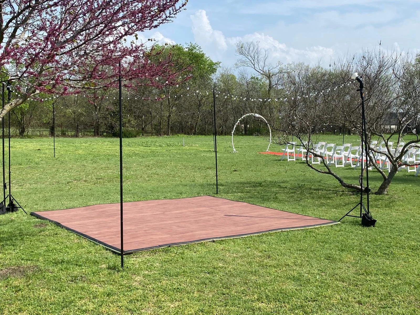 Outdoor wedding venue setup with wooden dance floor, white chairs, arch, and string lights on a grassy field.