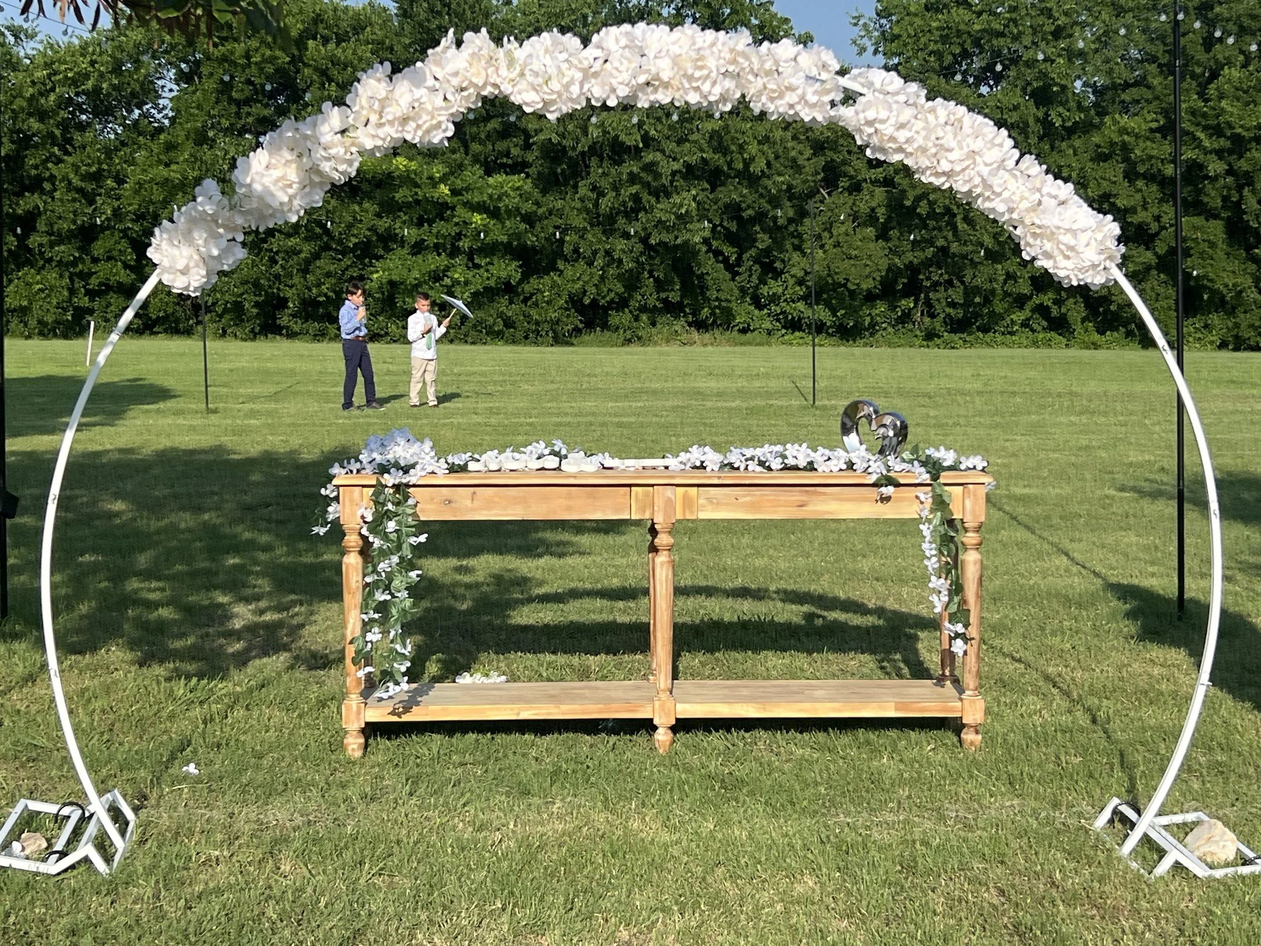 A white floral wedding arch with a wooden table decorated with white flowers and greenery, set up outdoors on a grassy field with a backdrop of trees.