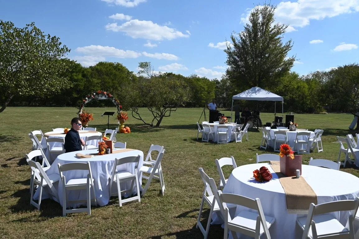 Outdoor event setup with white tables and chairs on a grassy field, decorated with fall-themed centerpieces. A small tent in the background with equipment and people setting up. Trees and blue sky in the background.