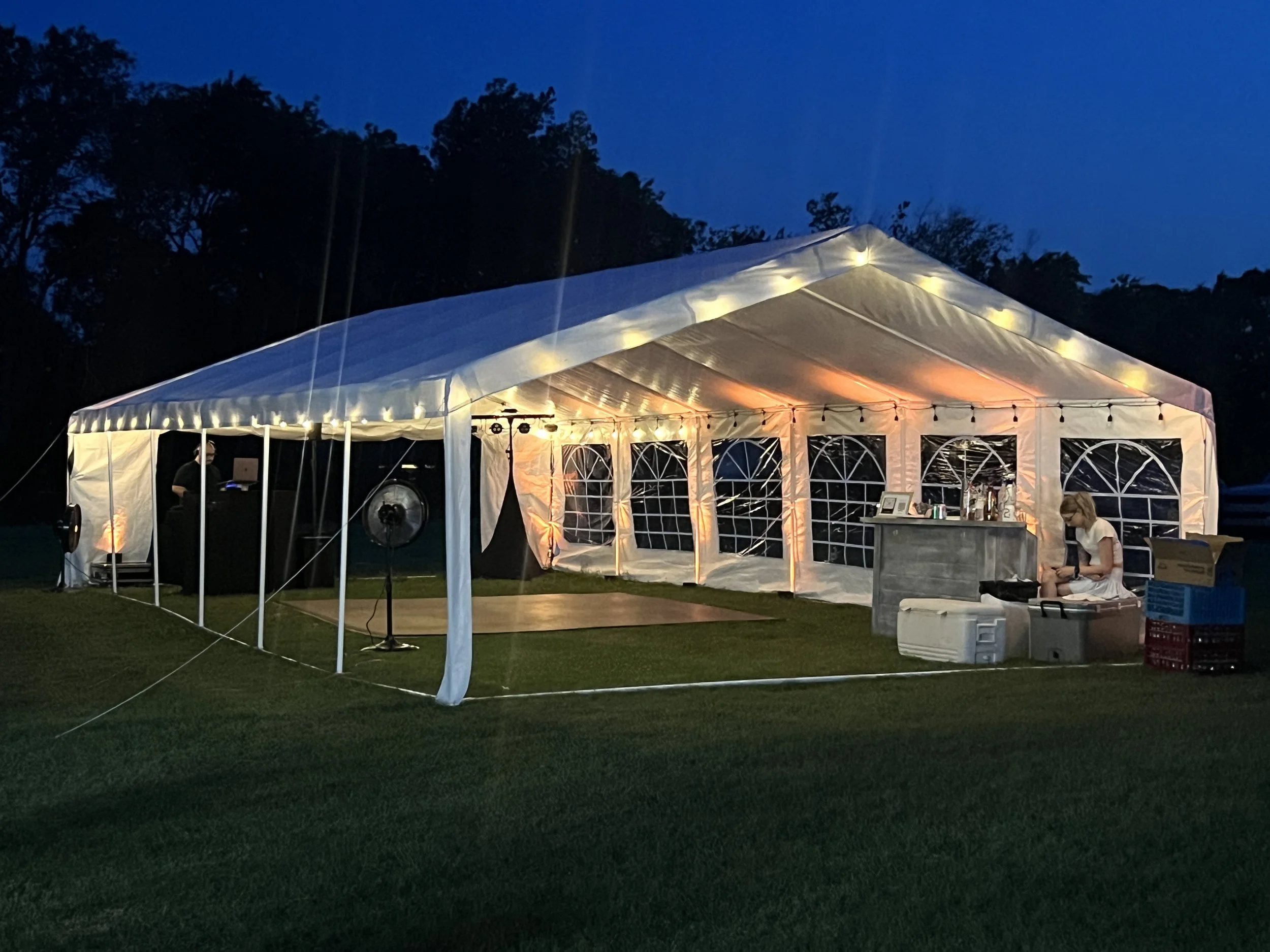 A large white event tent illuminated with string lights, set up outdoors on grass at night. Inside, there are tables, a person sitting on a cooler, and a DJ booth with a person working.