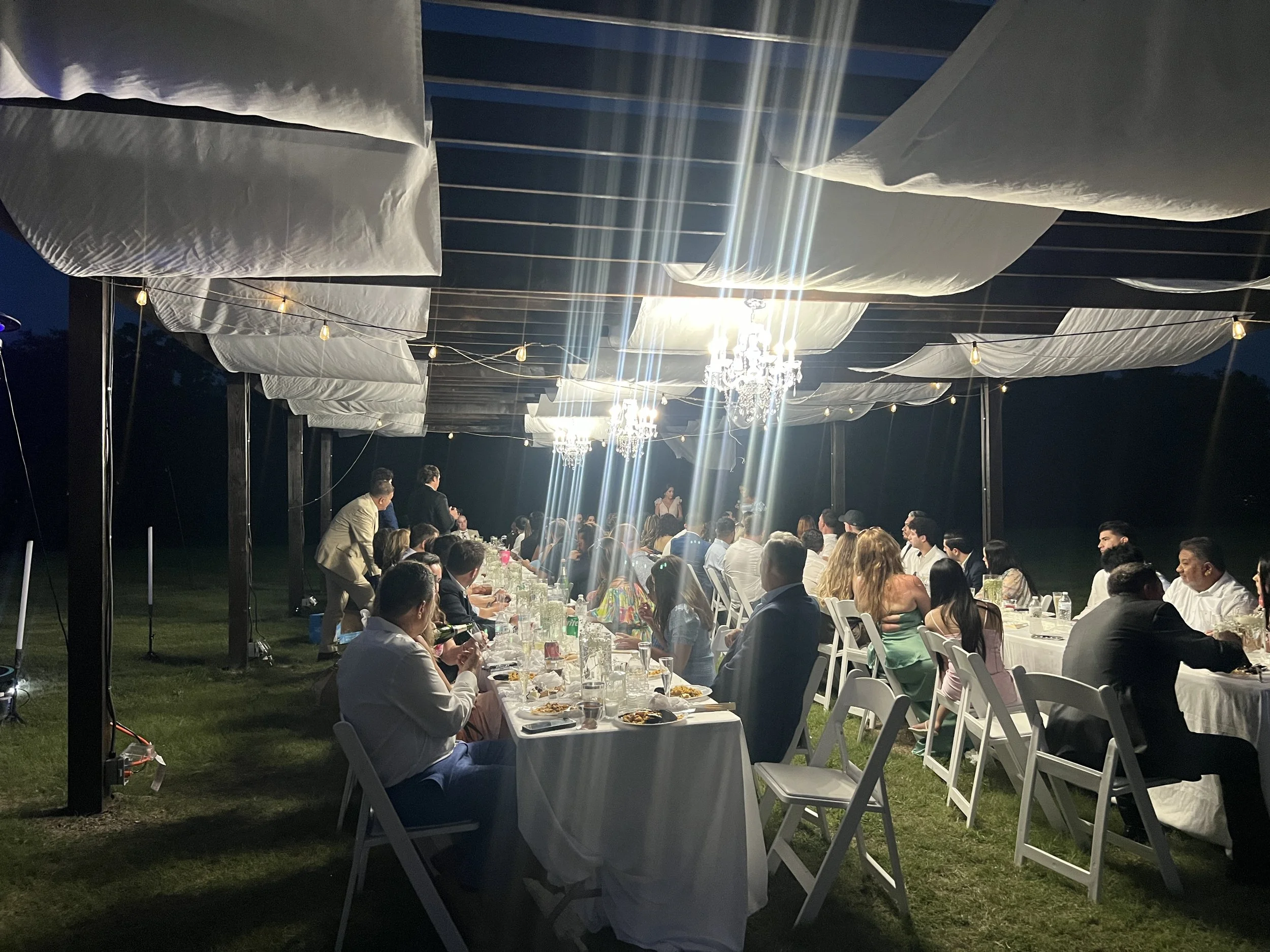 Outdoor evening dining event with long tables, white chairs, chandeliers, and string lights under a covered tent. People are seated, eating, and socializing.