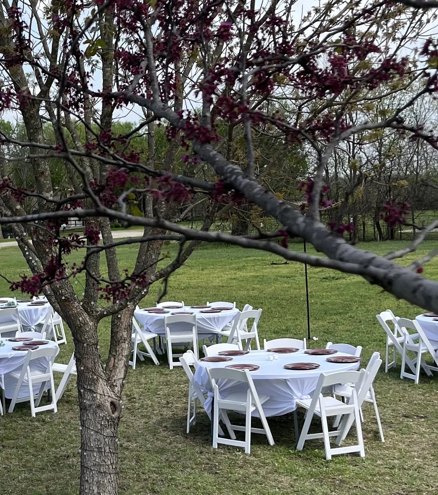 Outdoor event setup with round tables covered in white tablecloths, surrounded by white chairs, situated on a grassy area with trees.