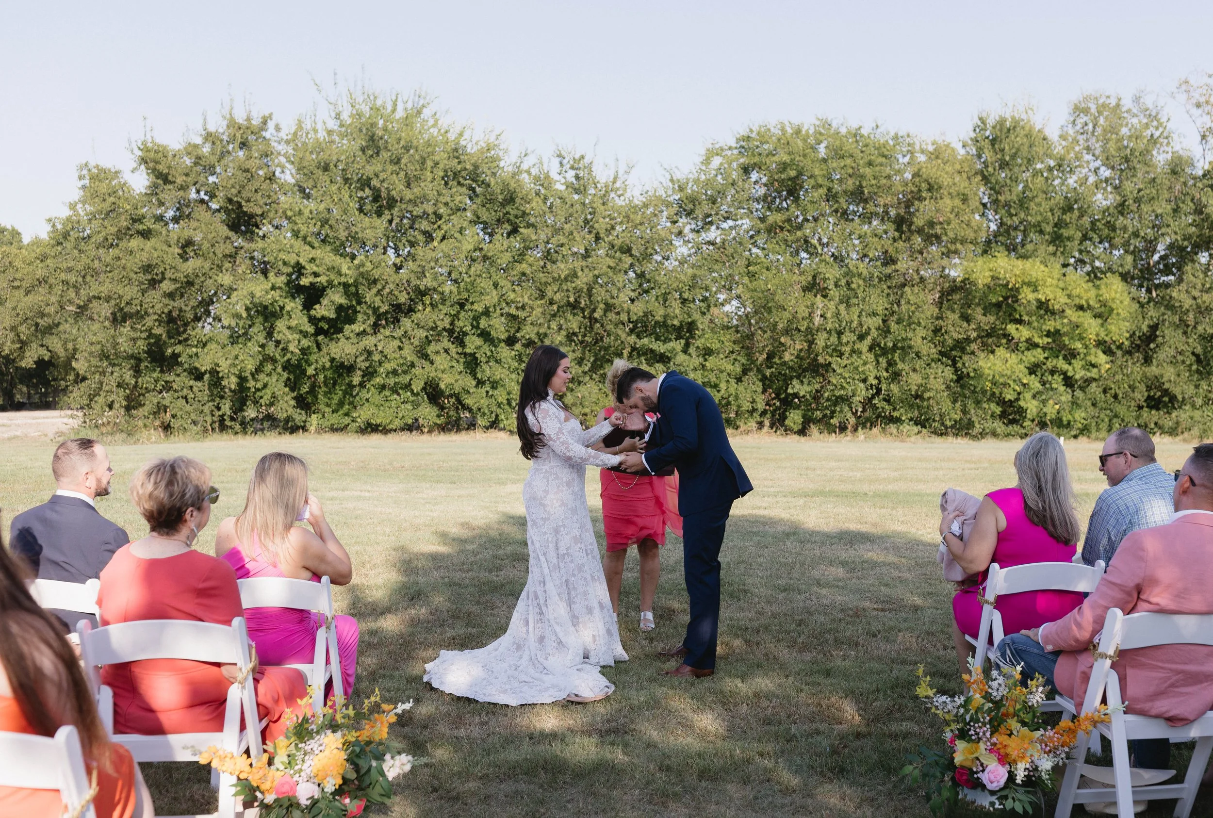 Outdoor wedding ceremony with bride in white gown and groom in navy suit holding hands, surrounded by guests seated on white chairs, with green trees in background.