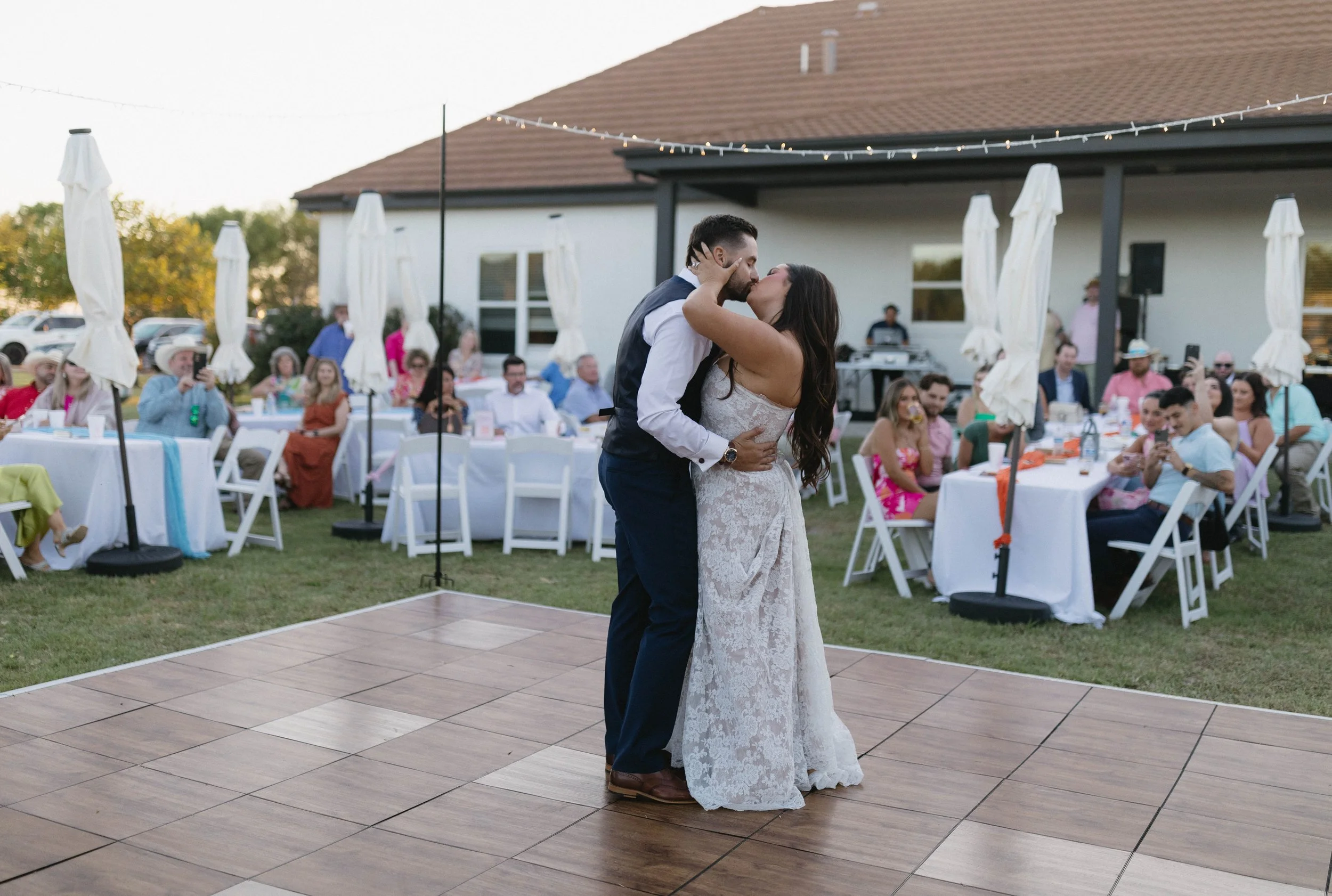 Bride and groom sharing a kiss during their first dance at an outdoor wedding reception. Guests seated at tables in the background, some taking photos.